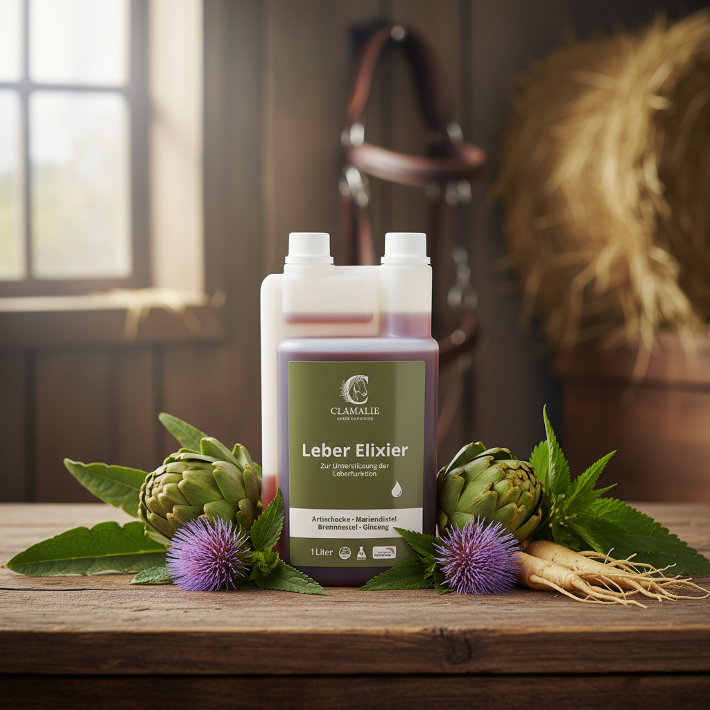 CLAMALIE Leber Elixier ist ein flüssiges Ergänzungsfuttermittel, das die Leber deines Pferdes bei wichtigen Stoffwechselprozessen unterstützt – von der Nährstoffverwertung bis zur natürlichen Entgiftung.