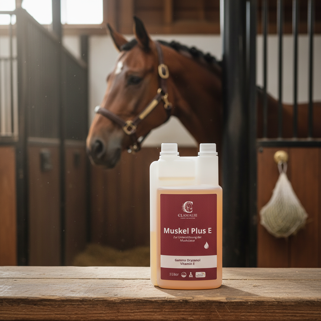 CLAMALIE Muskel Plus E ist ein flüssiges Ergänzungsfuttermittel zur gezielten Unterstützung der Muskulatur deines Pferdes – ideal für Sportpferde, ältere Pferde oder nach Verletzungen.